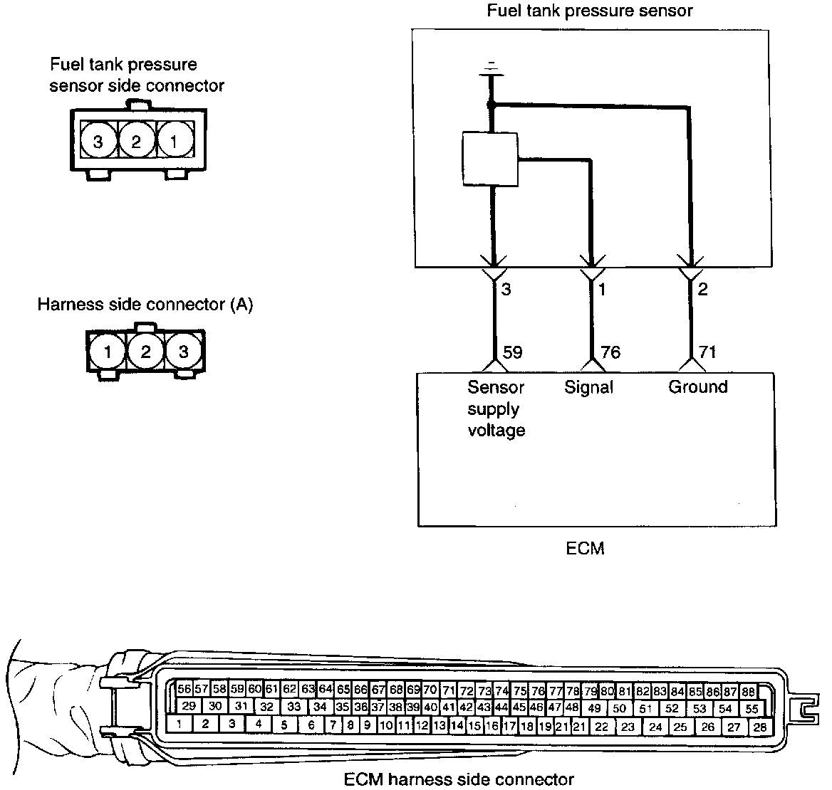 The [1][2]fuel tank pressure sensor is a pressure sensitive variable resistor. It measures the change of pressure in the fuel tank and monitors leakage detection. It is used to close the evaporative system and observes tank pressure respectively with canister close valve.