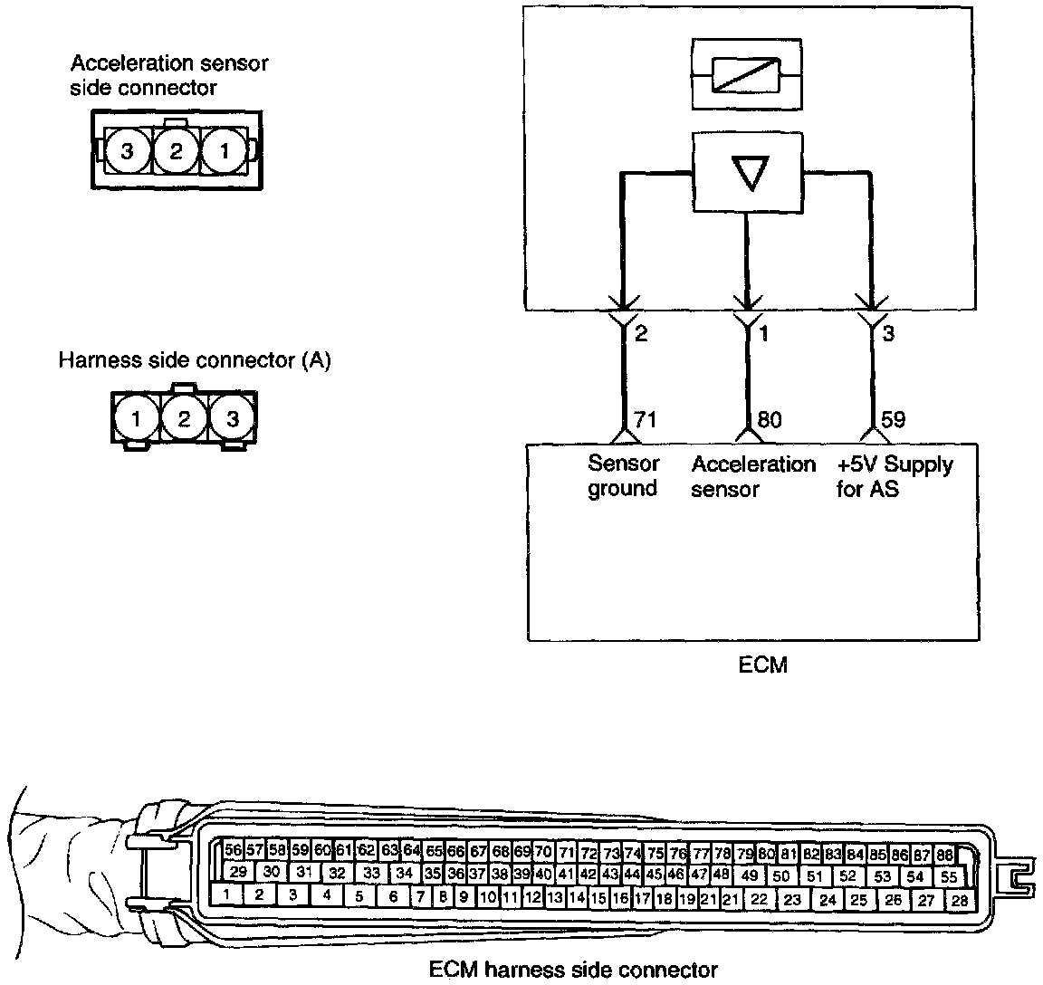 The acceleration sensor is attached in the engine compartment on the driver's side. While driving, the rough road condition is sensed by the acceleration sensor and the ECM uses this input signal to avoid the wrong misfire detection.