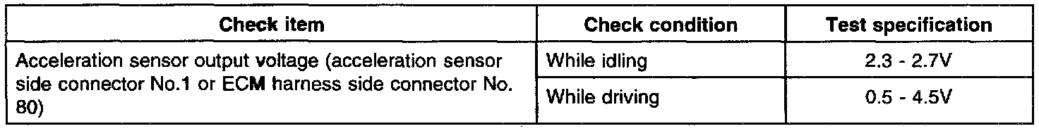 HINT: When abnormal output voltage occurs at stop position of vehicle or acceleration sensor is operated beyond normal operating zone.