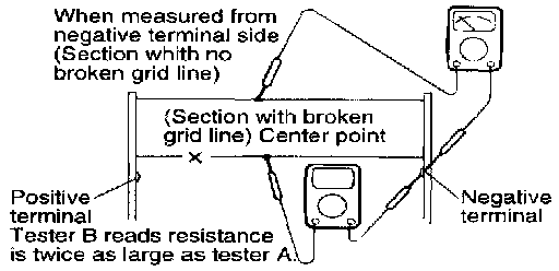 Use an ohmmeter measure the resistance of each heater line between a terminal and the center of a grid line and between the same terminal and the center of one adjacent heater line after another. The section involving a broken heater line indicates resistance twice as that in other section. In the affected section, move the test lead to a position where resistance sharply changes.