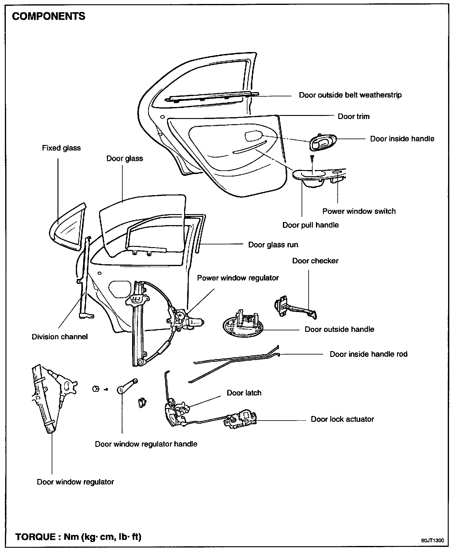 Door latch tightening torque 8-11 N.m (80-110 kg.cm,5.8-8.0 lb.ft)