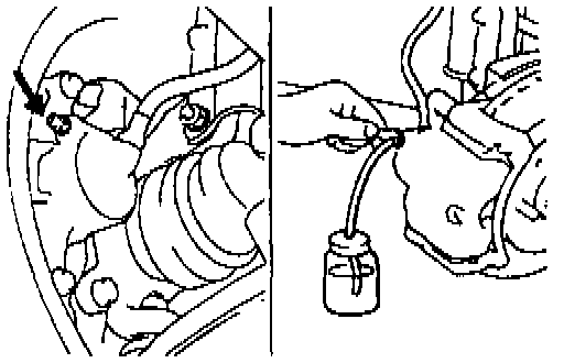 2. Connect the vinyl tube to the wheel cylinder bleeder screw, and insert the other end of tube in a half-full container of brake fluid.