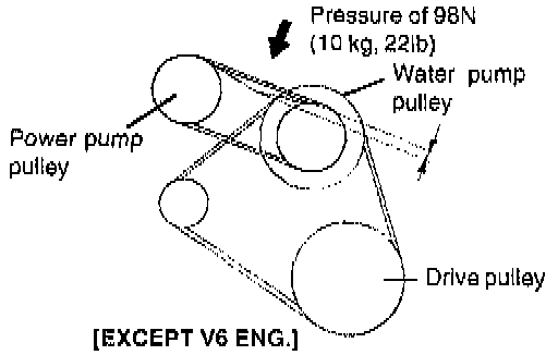 1. Press the V-belt applying a pressure of 98 N (10 kg, 22 lbs.) at the specified point, and measure the deflection to confirm that it is within the standard value range.