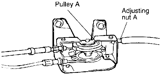 8. Tighten the adjusting nut A in the direction to lessen the inner cable play of the cruise control cable. At the position where the intermediate pulley A lever touches the intermediate pulley B, unscrew the adjusting nut A the specified number of turns.