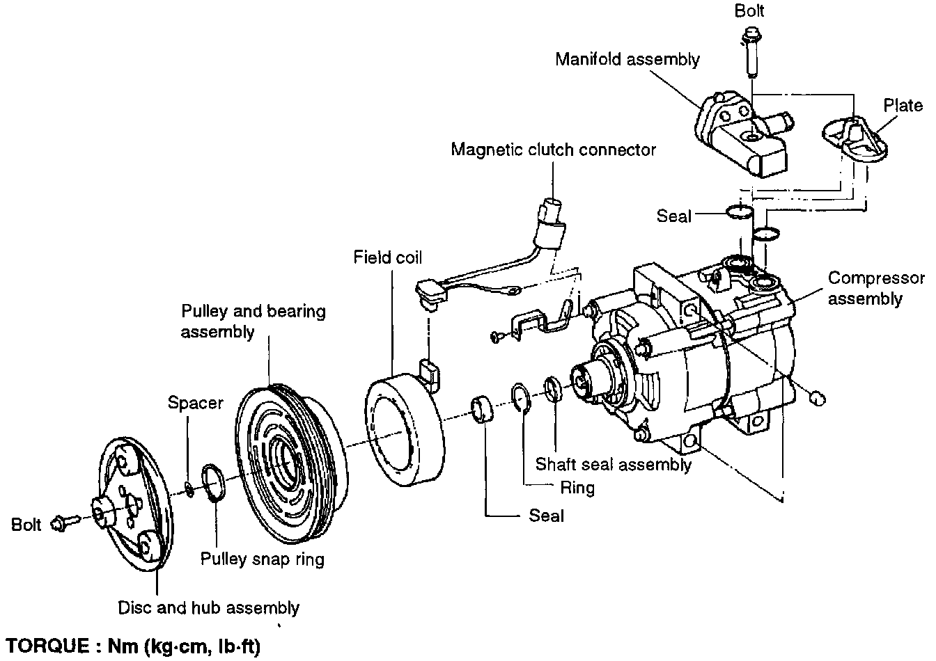 2. Pull the clutch hub and shims from the compressor shaft. If the hub cannot be pulled from the compressor shaft, screw an 8-mm bolt into the shaft hole of the clutch hub to force the hub from the shaft.
