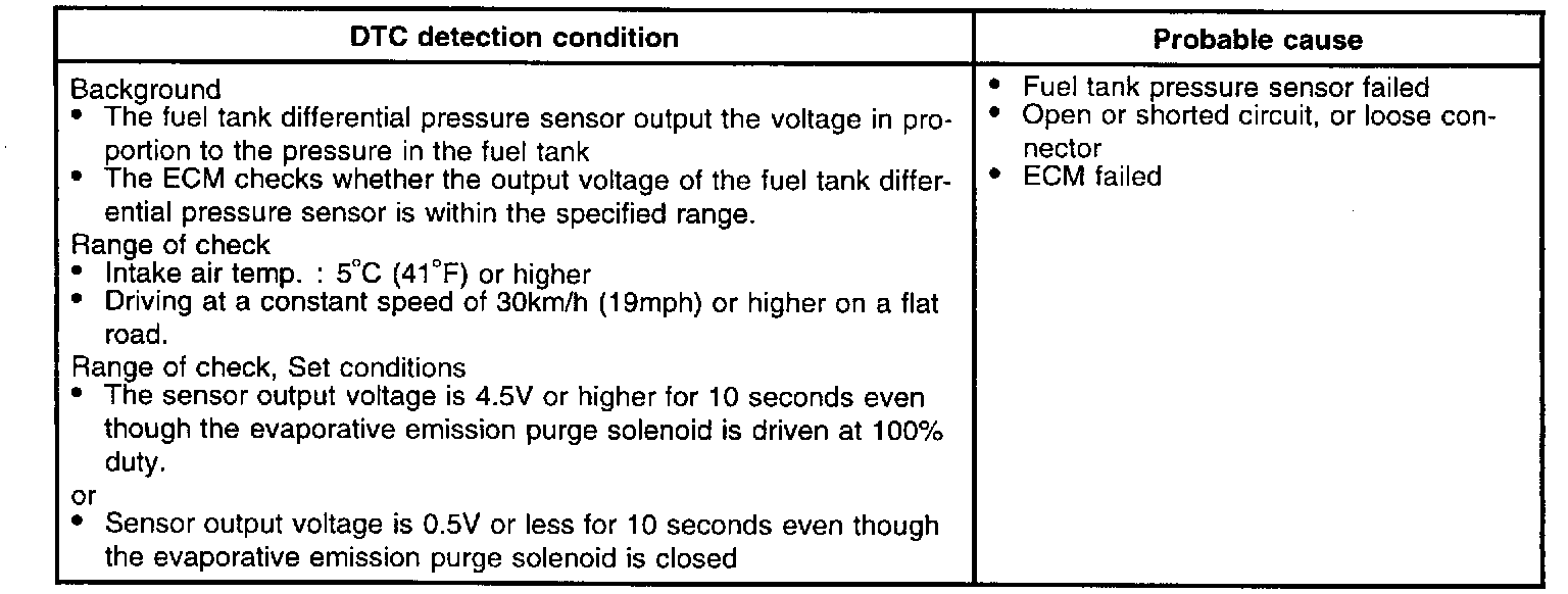 The Fuel Tank Pressure sensor is used to detect abnormalities in the evaporative emission control system. The ECM decides whether there is an abnormality in the evaporative emission control system based on the vapor pressure sensor signal.