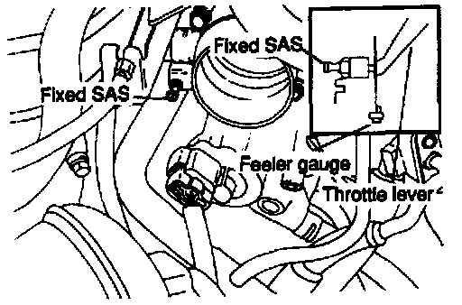 3. Insert a 0.65 mm (0.0256 in.) thick feeler gauge between the fixed SAS and throttle lever.
