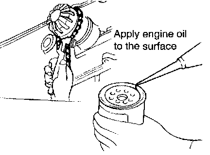2. Before installing the new oil filter on the engine, apply clean engine oil to the surface of the rubber gasket.