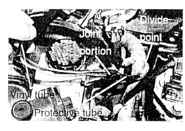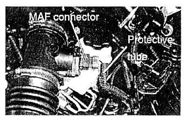 17. Replace the protective tube removed in step 4 over the MAF sensor connector wiring harness. Then tape the MAF sensor connector wiring harness from the end of the protective tube to the end of the vinyl tube with electrical tape.