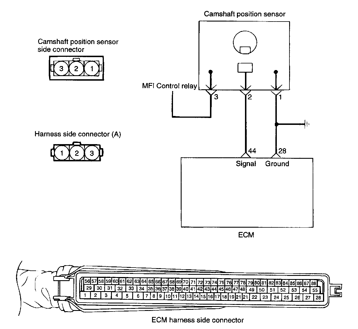 If the camshaft position sensor does not operate correctly, correct sequential injection does not occur so the engine may stall or run irregularly at idle or fail to accelerate normally.