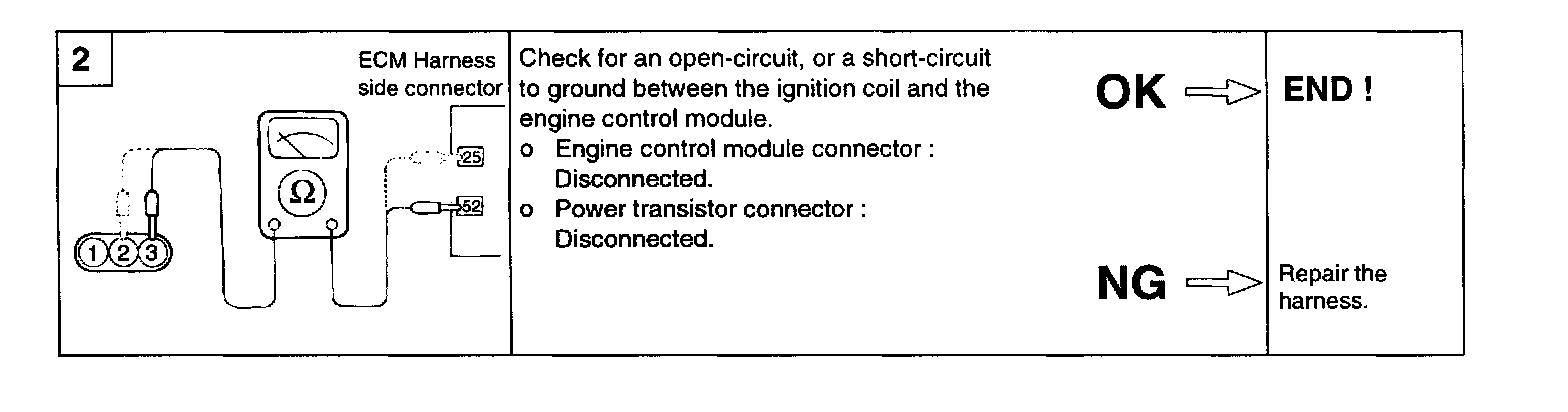 1. Measure the resistance between connector terminals 3 and 2 (the coils at the No.1 and No.4 cylinder sides) of the ignition coil, and between terminals 3 and 1 (the coils at the No.2 and No.3 cylinder sides).
