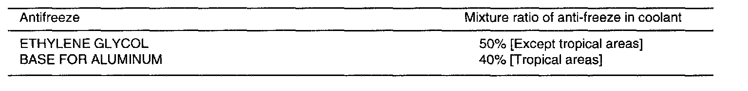 CAUTION: If the concentration of the coolant is below 30%, the anti-corrosion property will be adversely affected. In addition, if the concentration is above 60%, both the anti-freeze and engine cooling properties will decrease, affecting the engine adversely. For these reasons, be sure to maintain the concentration level within the specified range. Do not use together with another brand.