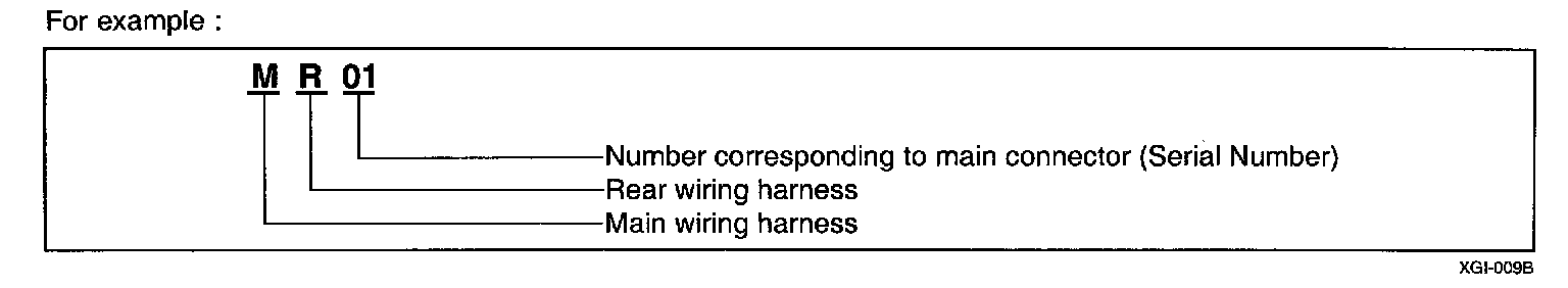 A connector identification symbol consists of a wiring harness location classification symbol corresponding to a wiring harness location and number corresponding to the connector. These connector locations can be found in the HARNESS LAYOUTS.