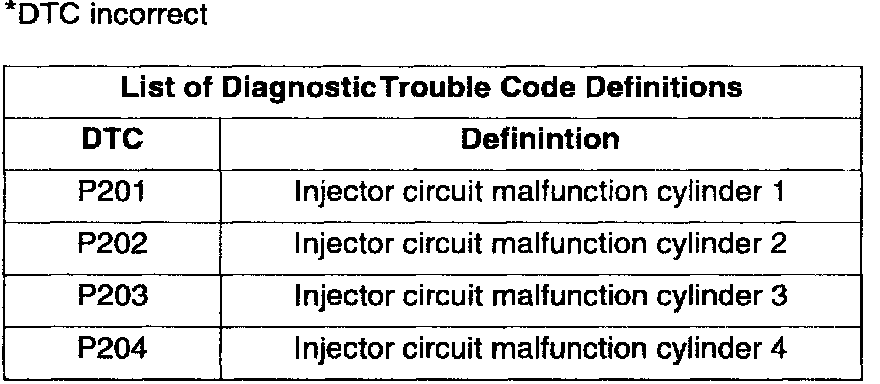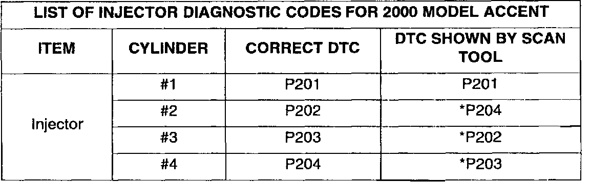The 2000 Accent ECM returns an incorrect Diagnostic Trouble Code (DTC) if an injector circuit malfunction occurs on cylinder numbers 2, 3 and 4. The table shows the correct DTC specification and the diagnostic trouble codes displayed.