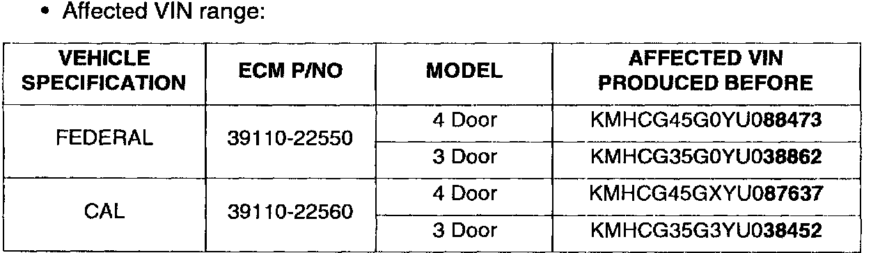 ^ Affected production date range: