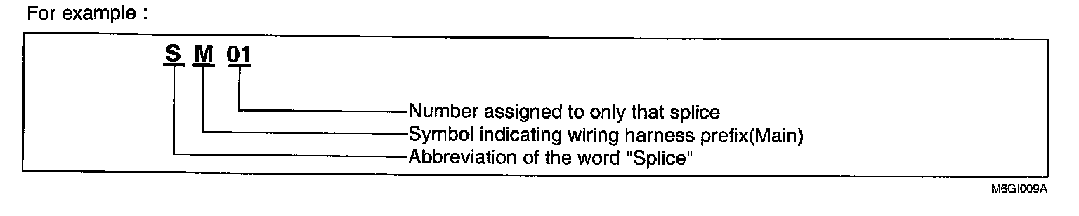 A splice identification symbol consists of a wiring harness location classification symbol corresponding to each wiring harness location and number corresponding to the splice. These splice locations can be found in the HARNESS LAYOUTS.