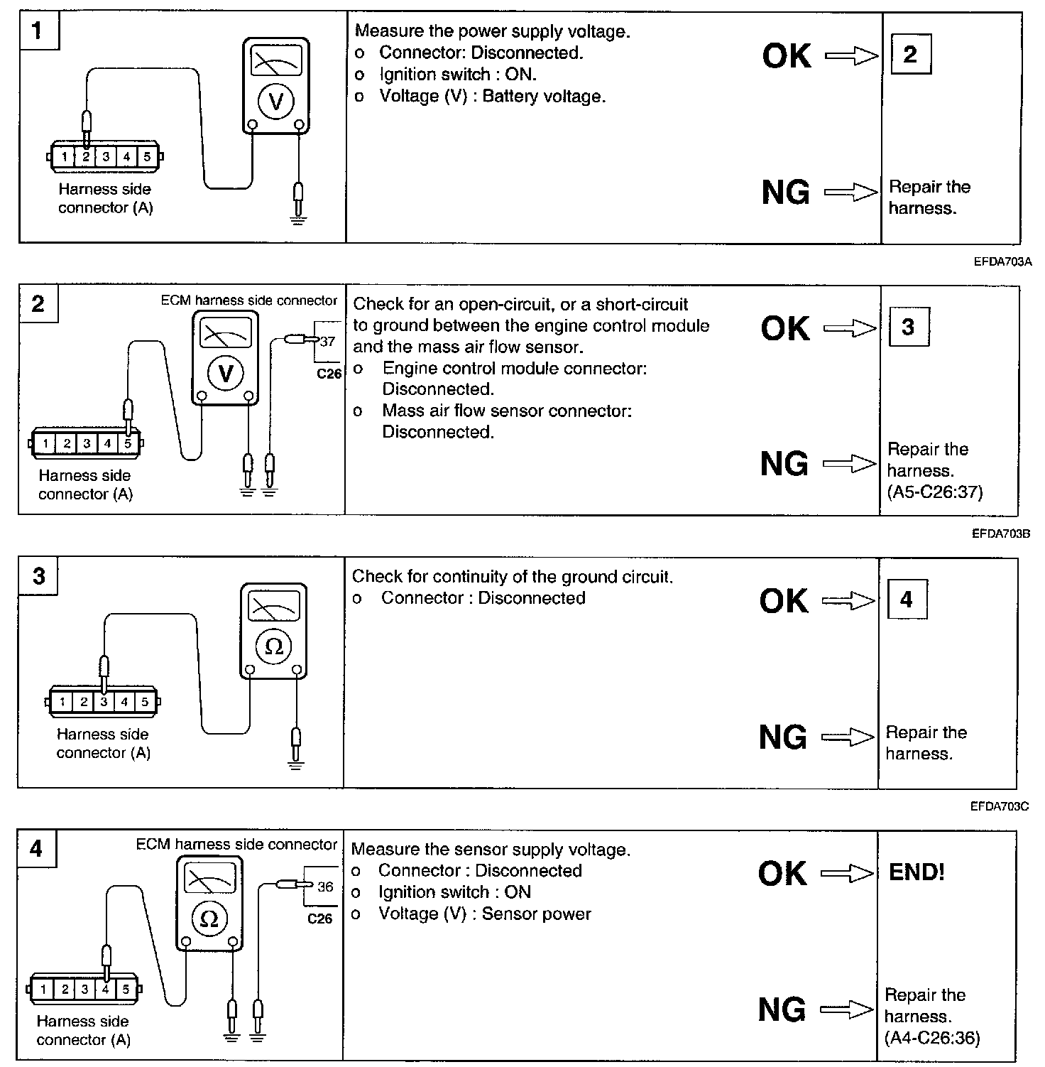 2. If the MAF sensor output voltage is other than 0 when the ignition switch is turned on (do not start the engine), check for a faulty MAF sensor or ECM.