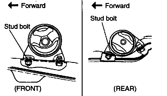 6. Temporarily tighten the front roll stopper bracket bolt. After the total weight of the engine has been placed on the vehicle body, securely tighten the nut.