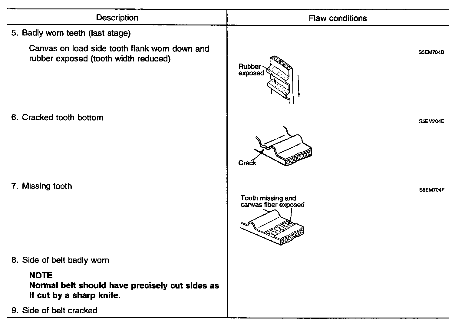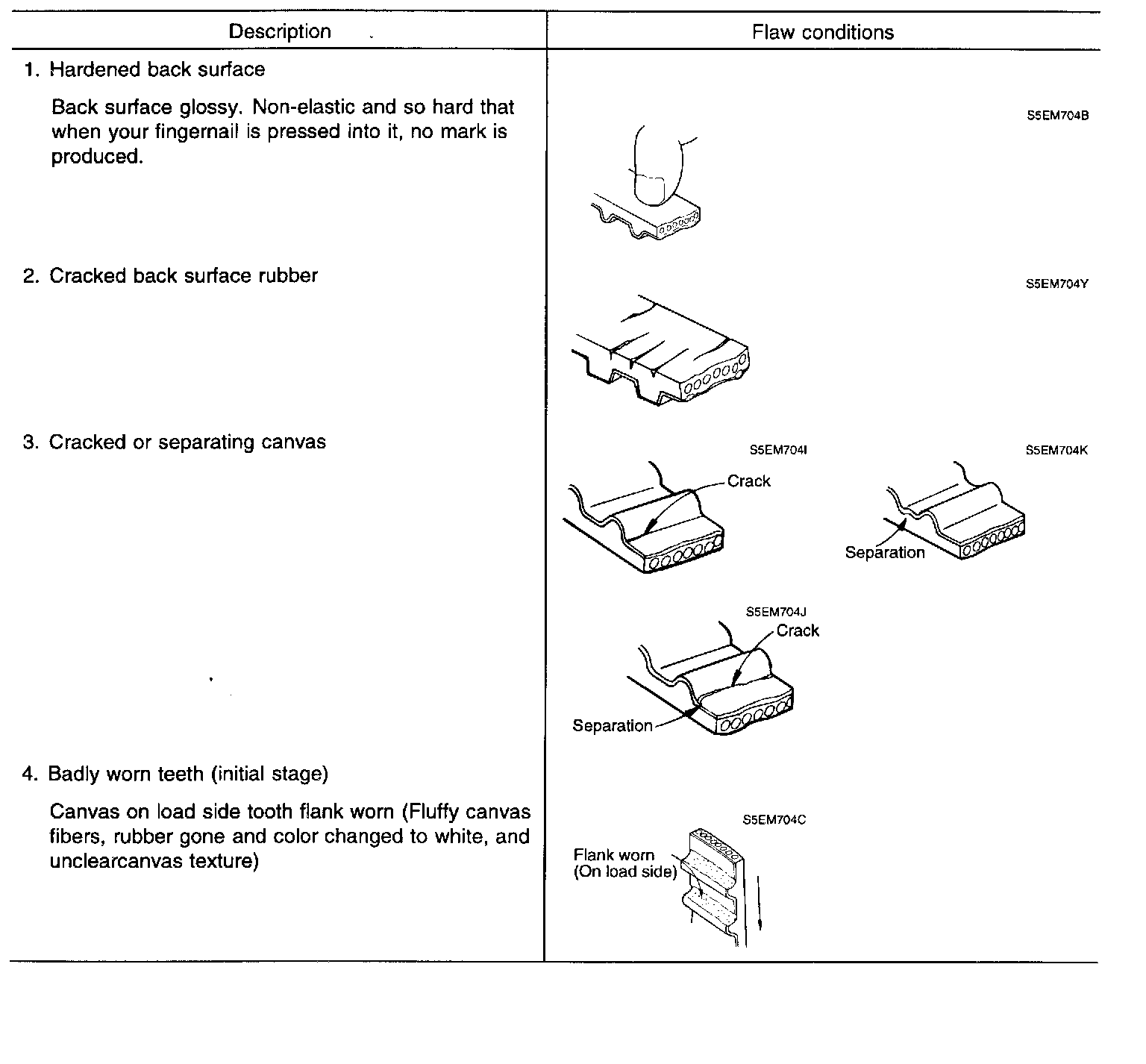 2. When the engine is overhauled or belt tension adjusted, carefully check the belt. If any of the above flaws are evident, replace the belt.