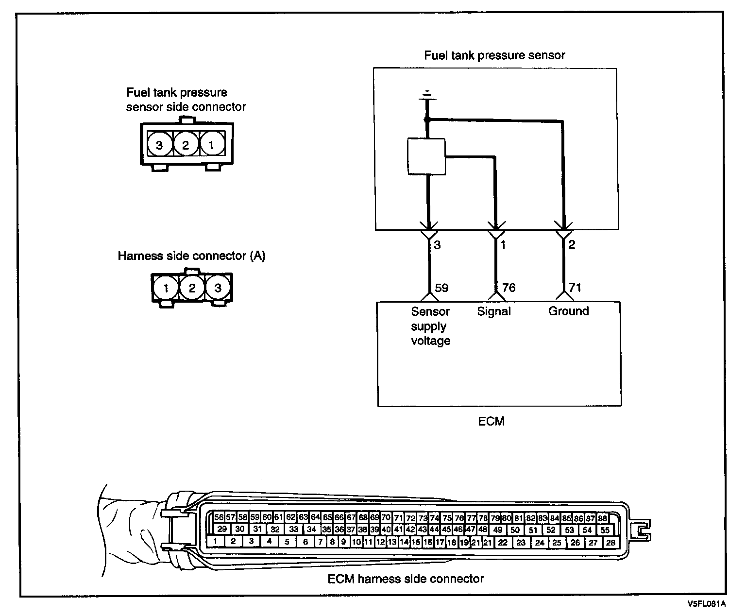 The fuel tank pressure sensor is a pressure sensitive variable resistor. It measures the change of pressure in the fuel tank and monitors leakage detection. It is used to close the evaporative system and observes tank pressure respectively with canister close valve.