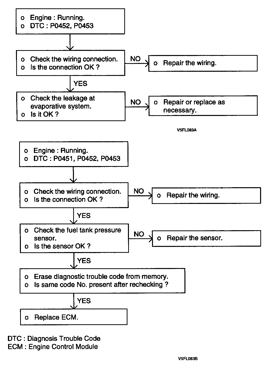 NOTE: If voltage is not within spec as procedures, there is leakage and inspect the fuel tank and hoses toward canister and fuel neck. Then repair or replace relevant parts.