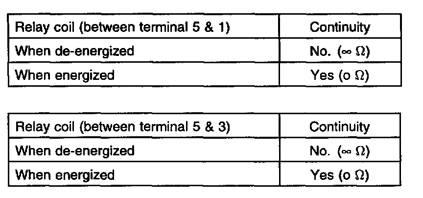 1. Check continuity of relay contacts between terminal 4 (+) and 2 (-)