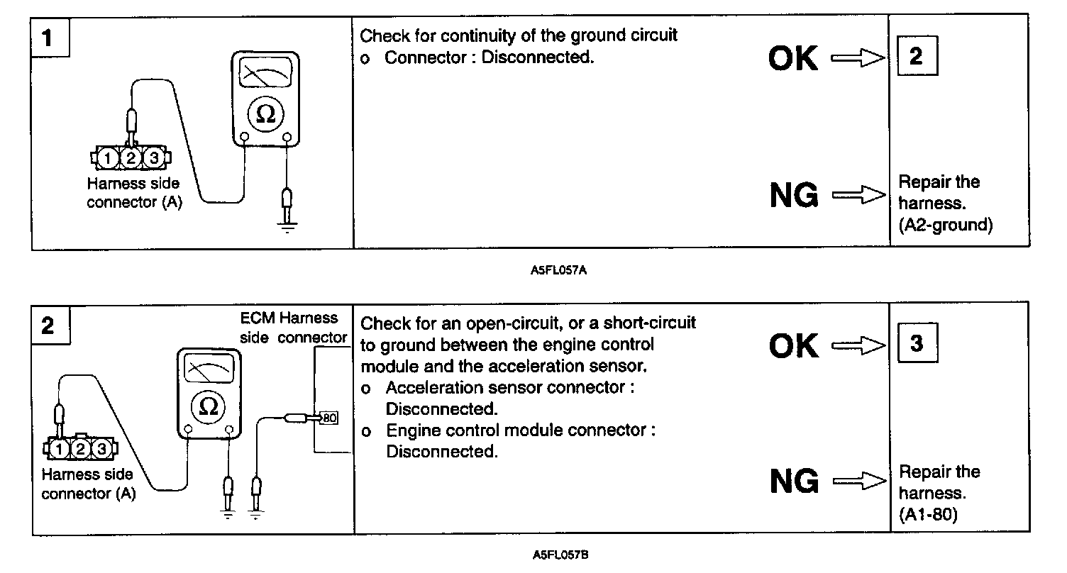 The acceleration sensor is attached in the engine compartment on the driver's side. While driving, the rough road condition is sensed by the acceleration sensor and the ECM uses this input signal to avoid the wrong misfire detection.
