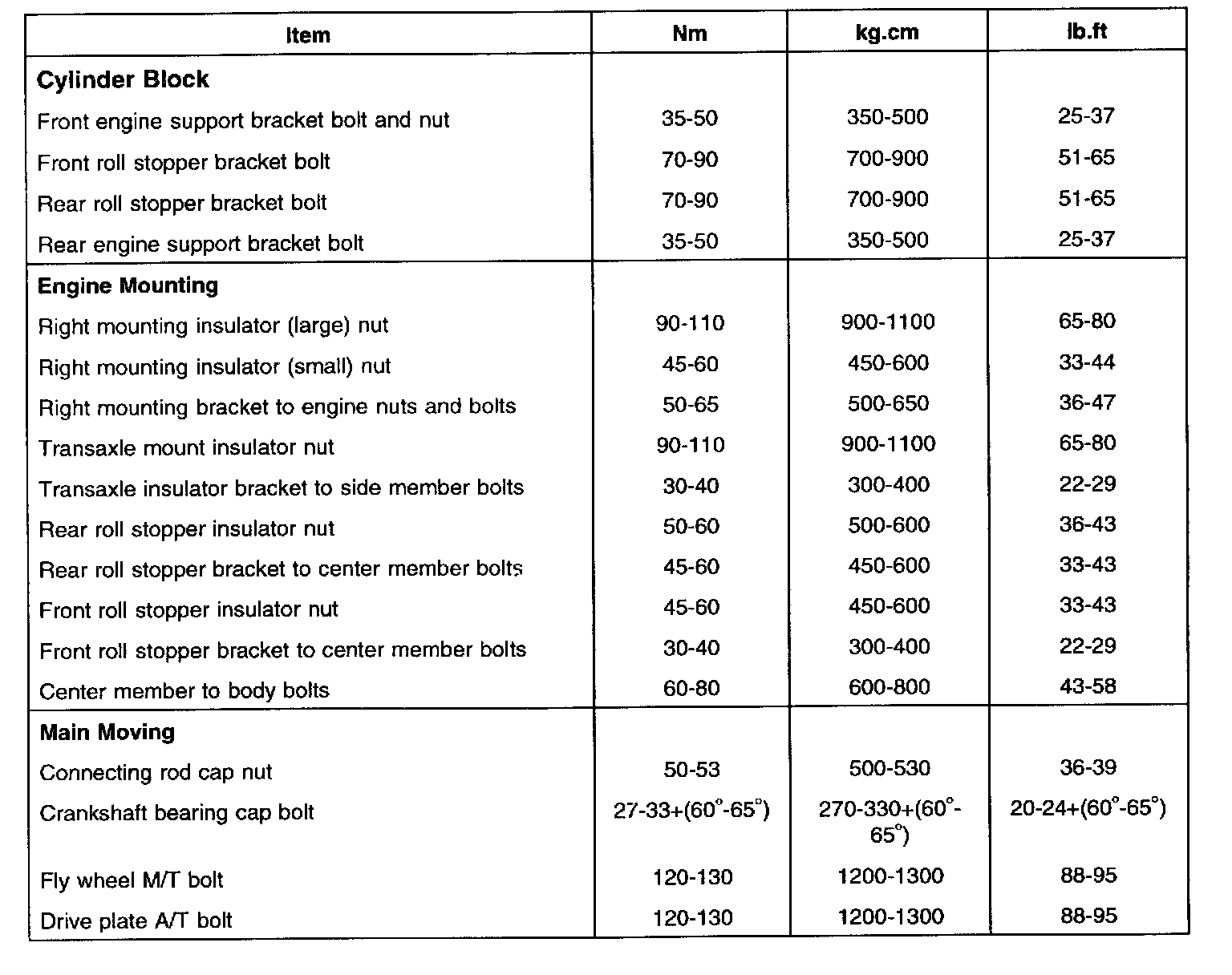 TIGHTENING TORQUE SPECIFICATIONSCylinder Block, Mounting and Main Moving