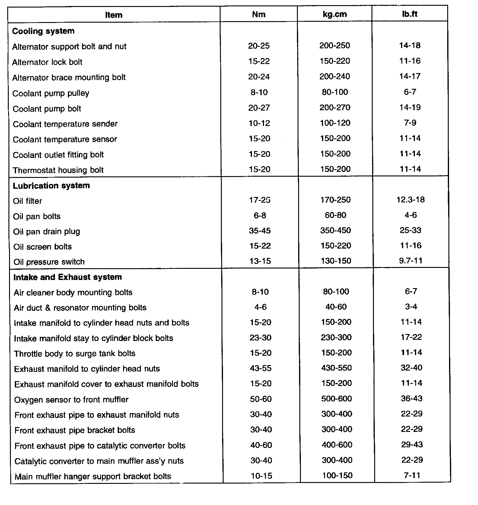 Tightening Torque Specifications