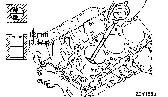 2. Measure the cylinder bore with a cylinder gauge at the three levels indicated in the directions of A and B.