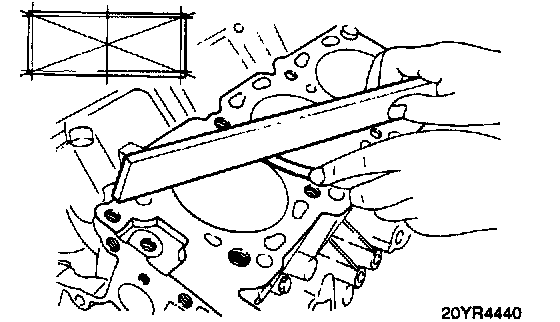 8. Check the top surface of the cylinder block for flatness. If the top surface exceeds limits, grind to the minimum limit or replace.