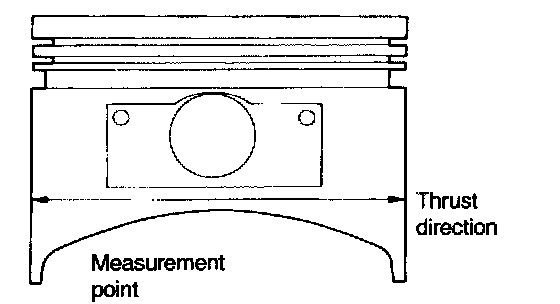 6. To rebore the cylinder to the oversize, keep the specified clearance between the oversize piston and the bore, and make sure that all pistons used are of the same oversize. The standard measurement of the piston outside diameter is taken at a level 12 mm (0.47 inch) above the bottom of the piston skirt and across the thrust faces.
