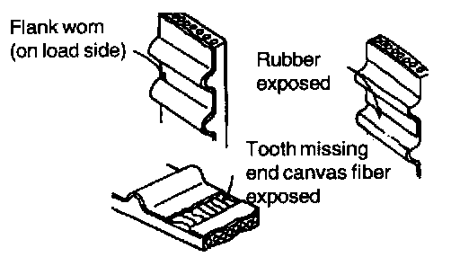 Canvas on the load side of the tooth flank worn down and rubber exposed (tooth width reduced)