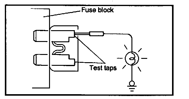 A blade type of fuse has test taps provided to allow checking the fuse itself without removing it from the fuse block. The fuse is good if the test lamp lights up when its one lead is connected to the test taps (one at a time) and the other lead is grounded. (Change the ignition switch position adequately so that the fuse circuit becomes operative.)