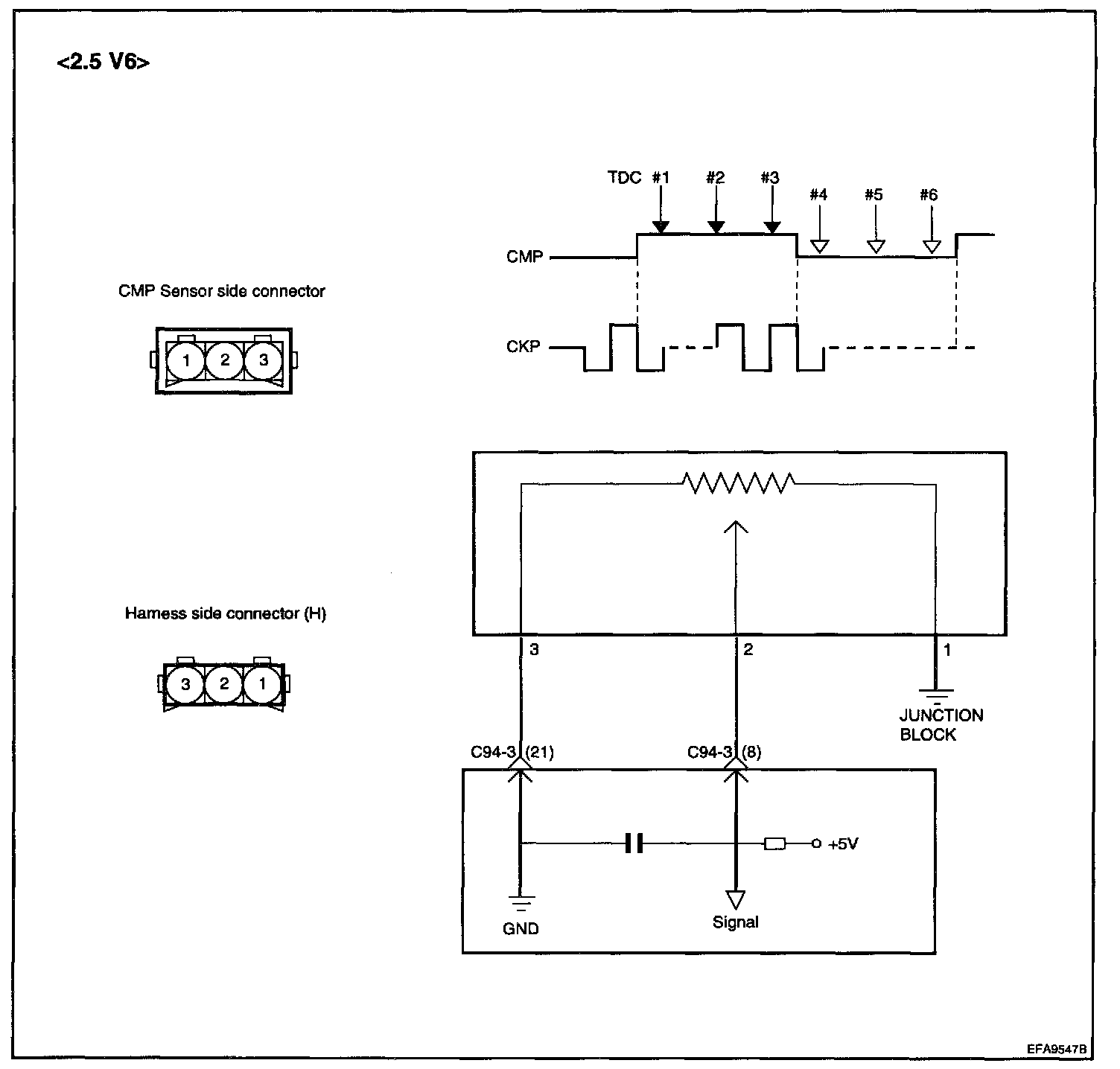 The crankshaft position sensor senses the crank angle (piston position) of each cylinder and converts it into a pulse signal. Based on the input signal, the ECM computes the engine speed and controls the fuel injection timing and ignition timing.Circuit Diagram: