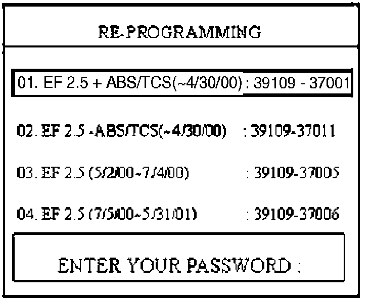 6. Enter the correct password after identifying the vehicle production date and by referring to the table in this TSB. In addition, use the ECM IDs written down during the automatic procedure to confirm the correct ECM version. Then press ENTER.