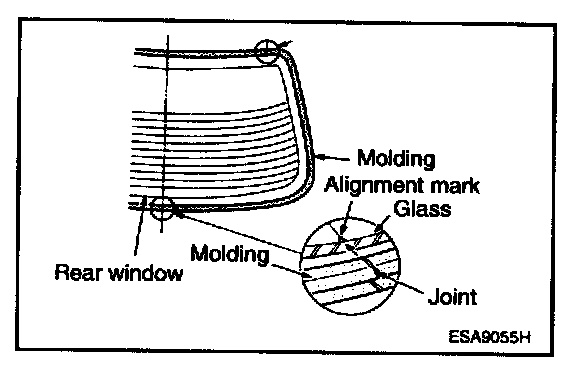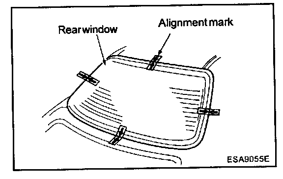 Make alignment marks across the rear window and body with a grease pencil at the four points shown.