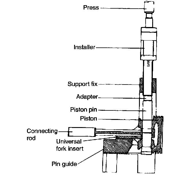 6. Position the rod inside the piston. Insert the proper pin guide through one side of the piston and through the rod. Hand tap the pin guide so it is held by the piston. Insert the new pin into the piston from the other side and set the assembly into the support fixture with the pin guide facing down.