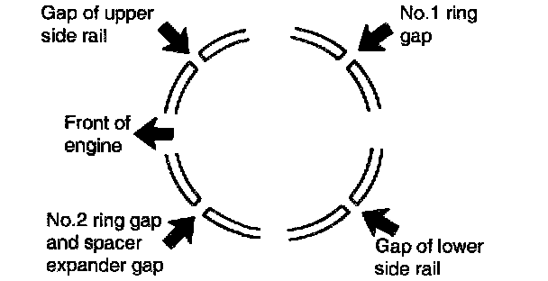 7. Position each piston ring end gap as far away from its neighboring gaps as possible. Make sure that the gaps are not positioned in the thrust and pin directions.