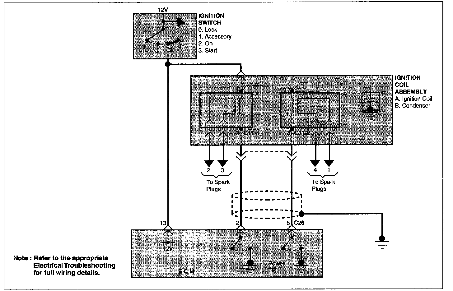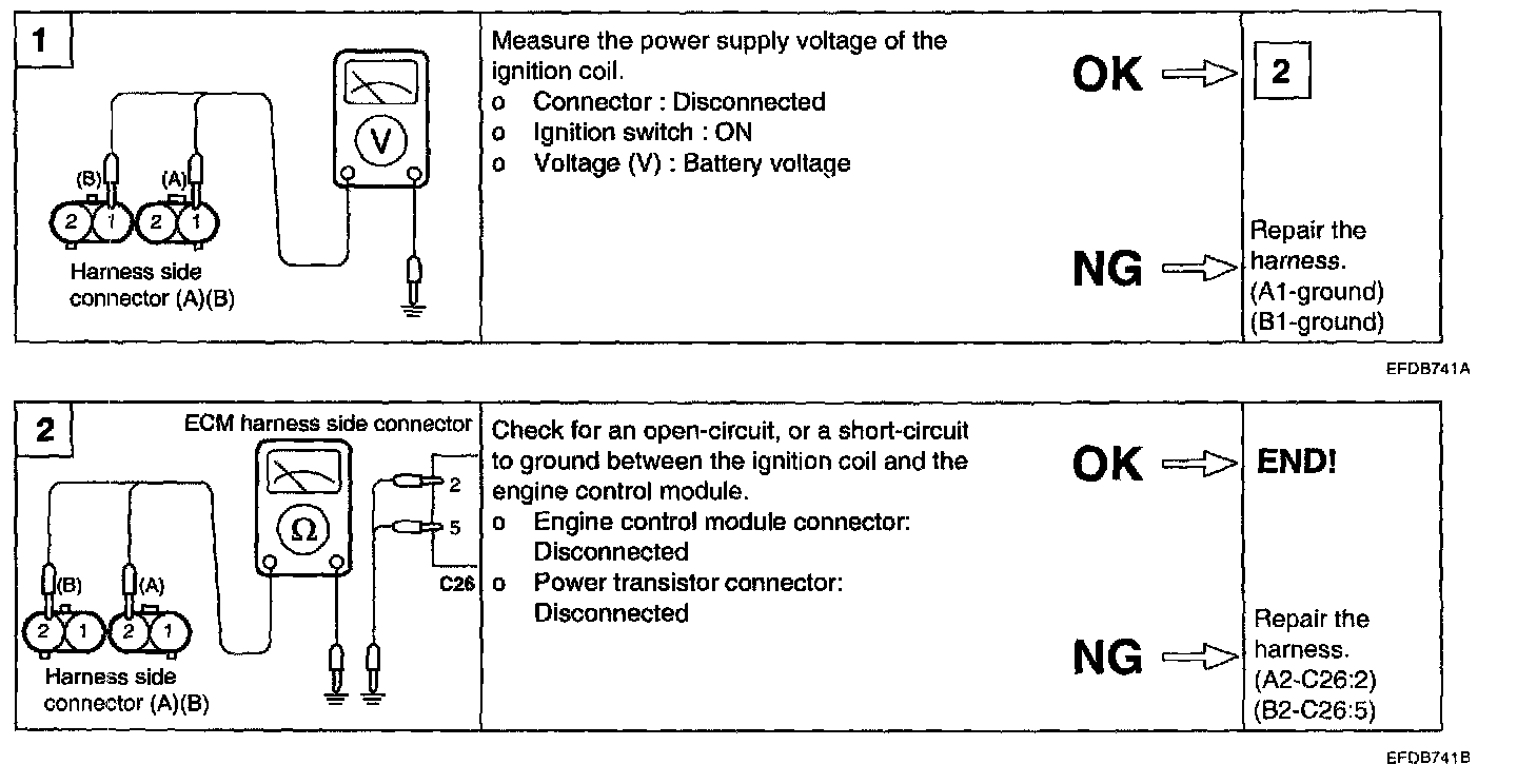 When the ignition power transistor is turned ON by a signal from the ECM, the ECM sends a signal to the ignition coil, then the primary current is shut off and a high voltage is induced in the secondary coil.