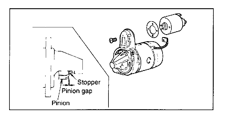 4. Check the pinion to stopper clearance (pinion gap) with a feeler gauge. If the pinion gap is out of specification, adjust by adding or removing washers between the solenoid and the front bracket.