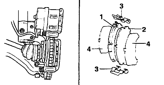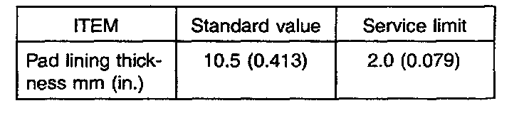 1. If the pad lining thickness is out of specification, the pads for the right and left wheels should be replaced at the same time.