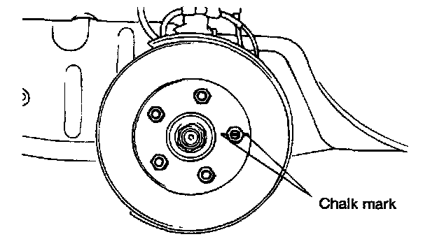 1) Before removing the brake disc, chalk both sides of the wheel stud on the side at which the run out is greatest.