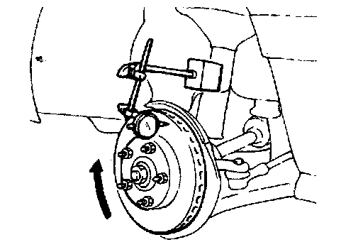 2) Remove the brake disc, and then place a dial gauge as shown in the illustration; then move the hub in the axial direction and measure the run out.