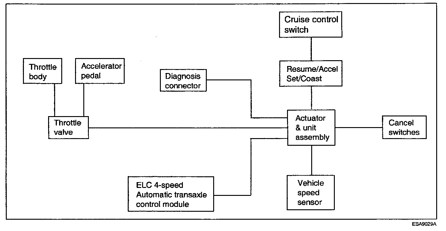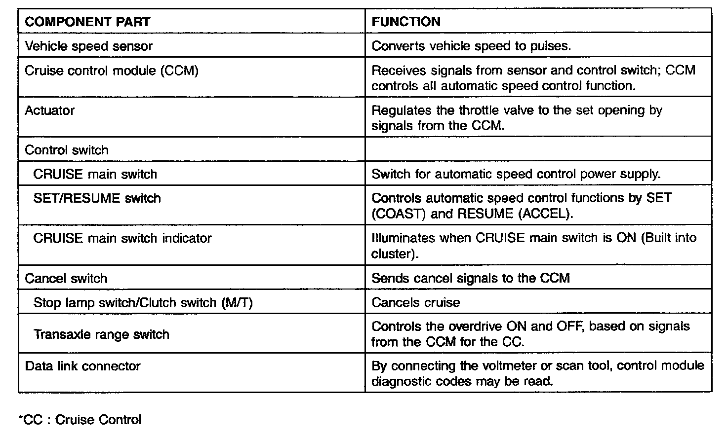 Circuit DescriptionThe cruise control system uses mechanical and electrical devices to maintain vehicle speed at a driver-selected setting. The cruise control module receives signals from the main switch in the cruise remote control switch, the stop lamp switch, transaxle range switch (A/T), over drive switch, clutch pedal position switch (M/T) and the vehicle speed sensor. The cruise control module provides signals to the cruise control actuator and the transaxle control module (A/T).
