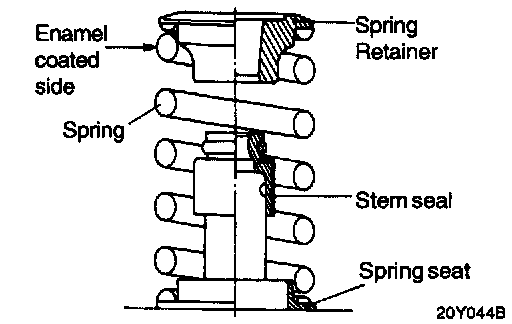 4. Place valve springs so that the side coated with enamel faces the valve spring retainer and then install the retainer.