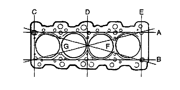 3. Check the cylinder head surface for flatness in the direction as shown in the illustration. If flatness exceeds service limit in any direction, either replace the cylinder head or machine the cylinder head matching surface lightly.