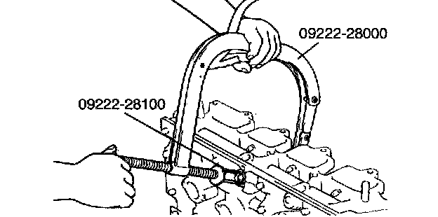 5. Using the special tool (09222-28000, 09222-28100), compress the spring and install the retainer locks. After installing the valves, ensure that the retainer locks are correctly in place before releasing the valve spring compressor.