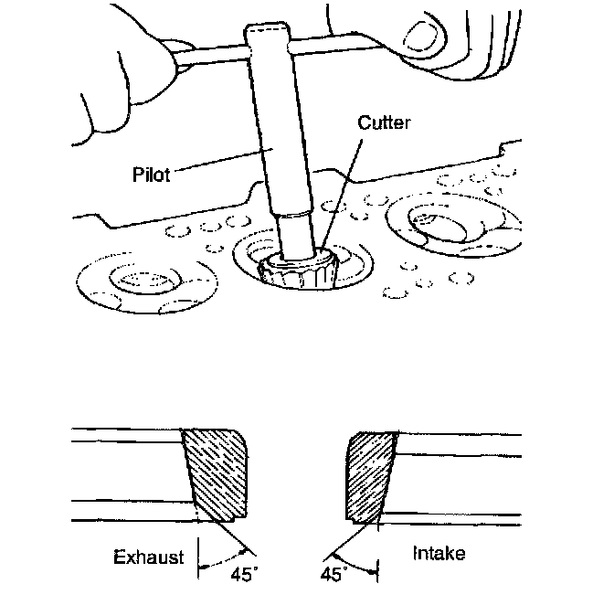 Check the valve seat for overheating and unequal contact with the valve face. Recondition or replace the seat if necessary. Before reconditioning the seat, check the valve guide for wear. If the valve guide is worn, replace it and then recondition the seat. Recondition the valve seat with a valve seat grinder or cutter. The valve seat contact width should be within specifications and centered on the valve face. After reconditioning, the valve and valve seat should be lapped lightly with a lapping compound.