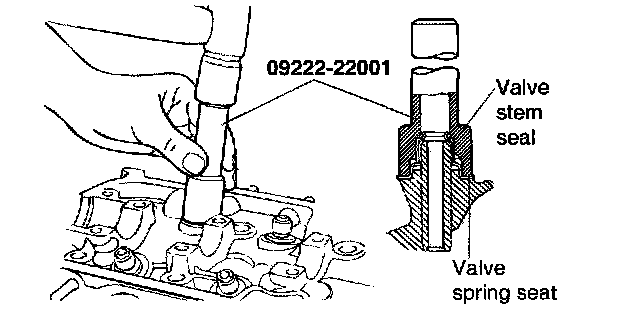 2. Using the special tool (09222-28000, 09222-28100), remove the valve spring retainer lock. Then remove the spring retainer, valve spring, spring seat and valve.